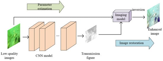 Traditional model-based underwater image enhancement methods usually need to estimate the transmission graph and parameters of the underwater image based on prior knowledge and other strategies, and those estimated values thus have poor adaptability. The method combined with the physical model mainly uses the excellent feature extraction ability of the convolutional neural network to solve the parameter values in the imaging model, such as the transmission diagram. In this process, CNN replaces the assumptions or prior knowledge used in traditional methods, such as dark channel prior theory. The network model is usually divided into two parts: first, the transmission figure is calculated in which the original image is input to the convolution neural network for feature extraction and to obtain the transfer diagram, and then, from the calculation, a clear image restoration is extracted by the transfer diagram, and the original image is entered into the optical imaging model for inversion calculation. The algorithm process is shown in Figure 4.
