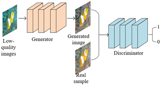 Generative adversarial network(GAN) was proposed by GoodFellow et al. [12]. A generative adversarial network (GAN) is used to produce better output through the mutual game confrontation learning of a generator and discriminator. By learning, the generator generates an image as similar to the actual image as possible so that the discriminator cannot distinguish between true and false images. The discriminator is used to indicate whether the image is a composite or actual image. If the discriminator cannot be cheated, the generator will continue to learn. The process is shown in Figure 5. The input of the generator is a low-quality image, and the output is a generated image. The input of the discriminant network is the generated image and the actual sample, and the output is the probability value that the generated image is true. The probability value is between 1 and 0. As an excellent generation model, GAN has a wide range of applications in image generation, image enhancement and restoration, and image style transfer.