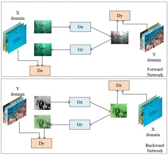 The cycle-consistent adversarial network (Cyc1eGAN) is an improvement on the traditional GAN network structure. A ring network consisting of two mirror-symmetric GAN generators and two corresponding discriminators is constructed. The structure is shown in Figure 7. CycleGAN trains two GAN networks. There are two generators, G,F and two discriminators, ,. G,F are used to learn the mapping relationship from the X to the Y domain and from the Y to the X domain. In order for the input image and generated image to correlate, it is required that and , and Cyc1eGAN is proposed for the cyclic consistency loss function. This structure solves the difficulty that GAN requires paired data for training and has good application in underwater images that lack paired data.