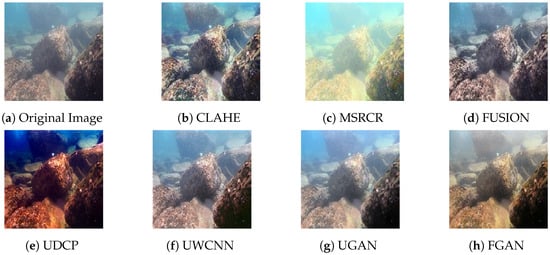 Gao et al. [46] proposed a method based on local contrast correction (LCC) and multiscale fusion to resolve low contrast and color distortion of underwater images. The local contrast corrected images are fused with sharpened images by the multiscale fusion method. The results show that this method can be applied to water degradation images in different environments effectively solving color distortion, low contrast, and unobvious details of underwater images. Although it aims to restore and enhance the underwater image, for the image with low resolution (the image contains some mosaics), the unnatural block mosaics will be enhanced in image detail enhancement. Song et al. [47] propose a method based on the multiscale fusion and global stretching of dual-model (MFGS). Use white-balancing to eliminate the undesirable color deviation and present an updated saliency weight coefficient strategy combining contrast and spatial cues to achieve high-quality fusion. At the same time, the global stretching of the full channel in the red, green, blue (RGB) model is applied to enhance the color contrast. In terms of the color richness of the resulting images and the execution time, there are still deficiencies with this algorithm.