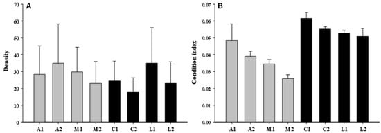Mean values (±SE) of mussel attributes. Density: Sqrt(X+1) transformed (A) and Condition index (B). Grey: non-urban shores (A1/A2: Âncora site 1 and 2, M1/M2: Moledo site 1 and 2); Black: urban shores (C1/C2: Cabo do Mundo site 1 and 2, L1/L2: Leça site 1 and 2).