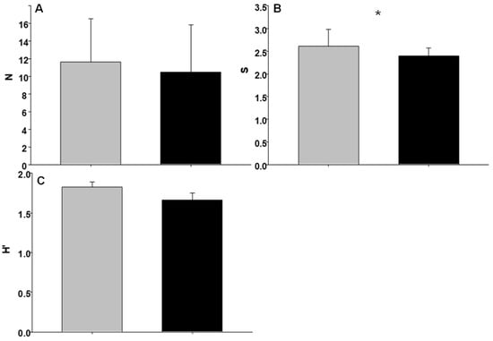 A total of 4798 individuals (2650 in non-urban shores and 2148 in urban shores) be-longing to 58 different taxa (53 in non-urban shores and 40 in urban shores) were identified. ANOVA indicated significant differences between conditions for S, with significantly higher values on non-urban shores (Table 3; Figure 3). However, no significant differences between conditions were found for N and H’ (Table 3, Figure 3).