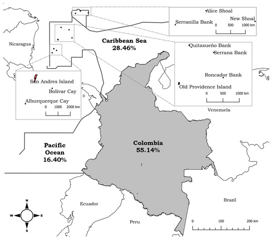 Colombia has a coastline with a length of 3531 km and approximately 892,102 km2 of surface area and coasts in both the Caribbean Sea and the Pacific Ocean, corresponding to 44% of the national territory [26]. The continental Caribbean region is made up of the coastal regions, as well as the insular area that includes San Andres, Old Providence, and Santa Catalina islands, in addition to seven cays as shown in Figure 1. In 2000, this insular zone was declared an International Seaflower Biosphere Reserve by the United Nations for Education, Science, and Culture [27,28]. The Pacific region includes the continental coasts, as well as the insular coasts of the Gorgona and Malpelo islands (Figure 1).