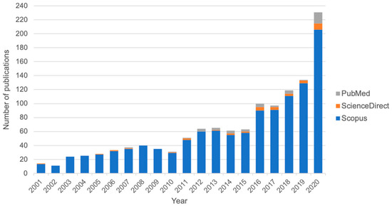 Number of publications of seaweed review articles in the databases. Source: Scopus, ScienceDirect, and PubMed. The figure shows the increasing number of publications on seaweed in recent years.