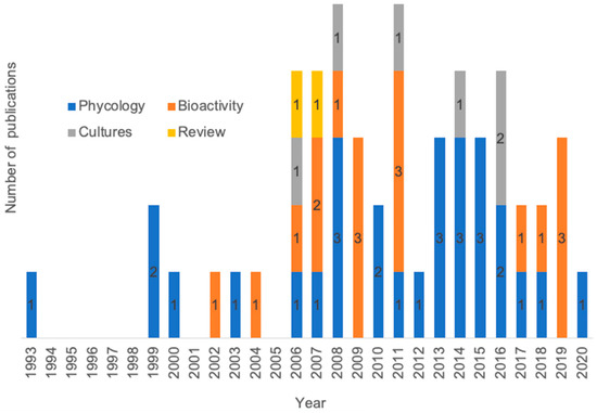 Our main findings indicated that research on seaweeds in Colombia is at a preliminary stage. In recent years, there has been an increasing number of publications focused on taxonomic identification, biological evaluation of extracts, as well as the establishment of a few pilot cultures (Figure 3).