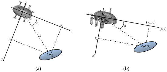 The range and bearing angles are considered to be four tracking errors. Figure 2a is the horizontal projection of the underwater robot and the target from the top view perspective in {B}. Figure 2b is the vertical plane projection of the underwater robot with the axis coplanar with the target in {B}. It can be seen that is the distance from the projection of the target on the plane to the point; is the angle between the line projected by the target and the underwater robot on the plane and the axis; is the distance from the plane to the target in {B}; and is the angle between the line of the underwater robot to the target and the plane, as shown in Figure 2.