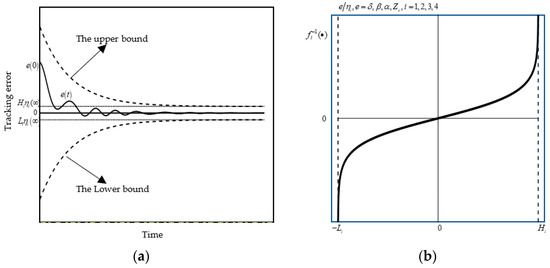 where, and are positive real numbers, and should be guaranteed. is called the performance function, which could govern the dynamic and steady state performances of the errors. It is defined as and , where should be sufficiently small positive real numbers. determines the final boundaries of the tracking error. determines the convergence rate of the tracking errors, which is mainly related to the dynamic performance of the system. The prescribed performance and error transformation function are shown in Figure 3.