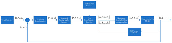 Many advanced control methods have been used in the control of underwater robots, such as backstepping control [4,5,6], model predictive control [7,8], neural network control [9,10,11,12,13], active disturbance rejection control [14,15,16], sliding mode control [17,18,19,20,21,22,23], adaptive and distributed control [24,25,26] and reinforcement learning [27,28,29,30]. In the above methods, sliding mode control has been widely studied or used because of its strong robustness to the external time-varying disturbance and unmodeled characteristics, fast responses and easy implementation. Yingkai Xia et al. designed of an improved line-of-sight-based adaptive sliding mode tracking controller for highly coupled dynamics, ocean current disturbances and input saturation of underactuated autonomous underwater vehicles (AUVs) [21]. For the problems of the remote operated vehicle (ROV) movement instability and large tracking error caused by unknown disturbances, an adaptive sliding mode motion controller was developed by Zongsheng Wang et al. [20]. However, the standard sliding mode control can only realize the asymptotic stability of the system, and cannot guarantee the convergence time. As an effective method to speed up the convergence of tracking errors, terminal sliding mode control achieves finite-time stability by introducing fractional order terms when constructing a sliding hyperplane. For underactuated underwater vehicles, Taha Elmokadem et al. designed a target tracking controller based on terminal sliding mode control, and proved that the tracking errors can converge to zero within a specified finite time [18]. However, the negative fractional power terms contained in the controller may lead to a singularity when the errors converge. Cao Jian et al. designed a non-singular terminal sliding mode controller that evades the issue of a singularity in the target tracking problem of underwater robots [31]. Nevertheless, it is necessary to obtain the upper bound of uncertainty in advance. Strong robustness can be obtained by setting a larger switching gain. However, this will lead to a serious chattering problem, affect the control accuracy and increase the energy consumption, which are harmful to the tracking control of underwater robots. B.M. Patre et al. added a state observer to the sliding mode controller to reduce the switching gains [19], thereby attenuating the chattering. The precondition of applying this method is that the uncertainty changes slowly and the first derivative is almost zero, which is inconsistent with the actual working environment of underwater robots. In practice, underwater robots are always subject to various uncertainties, such as unknown parameters, unmodeled time-varying dynamics and measurement noise. A neural network can approximate nonlinear time-varying functions and has been becoming one of the most effective ways to observe uncertainties [9,12,13]. It is worth noting that a neural network can reduce the switching gain of a sliding mode controller by approximating unmodeled uncertainties. Therefore, a terminal sliding mode controller combined with RBF neural network technology improves the tracking control performance while attenuating chattering.
