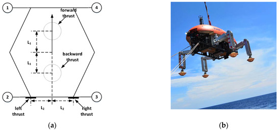 The underwater robot: (a) the thruster layout; (b) the physical prototype.
