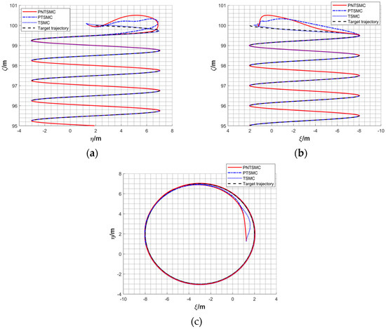 In order to better understand the performance of different controllers, typical criteria such as steady-state error, convergence time and root mean square error are used for a quantitative comparison in Table 2. The steady-state error reflects the control accuracy and anti-disturbance ability of the system. The convergence time reflects the dynamic time of the system. In addition, root mean square error is reported to describe the controller’s control performance during the whole tracking process. Firstly, the results of the simulation for PNTSMC and TSMC are compared. It can be seen that PNTSMC has advantages over TSMC in steady-state error, which shows that PNTSMC can achieve more accurate tracking. As for the convergence time, the convergence times of tracking errors , and were shortened by 30.74, 0.152 and 0.621 s, respectively—reduced by 74.4%, 3.2% and 19.1%. The convergence time of tracking error increased by 1.171 s, that is, 36.8%. In general, PNTSMC accelerated the convergence process. The root-mean-square errors of the tracking errors of the PNTSMC are all smaller, corresponding to , , and , which were reduced by 0.4238, 0.1279, 3.1862 and 0.0012 m, respectively—70.5%, 25.2%, 50.1% and 11.0%. Secondly, for the comparison between PNTSMC and PTSMC, the gap between the two is very small by most criteria. The performance of PNTSMC was slightly better. In conclusion, we demonstrated the advantages of PNTSMC in rapid acquisition of stability and accurate trajectory tracking due to the prescribed performance technique.