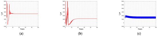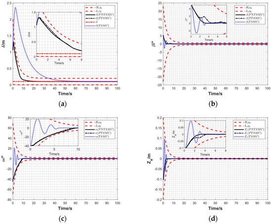 The limits of control moments and forces are −6000 to 6000 N(Nm). Since there is no thruster actuator in the direction, . is a smooth nonlinear term, and it can be expressed according to Equation (2):