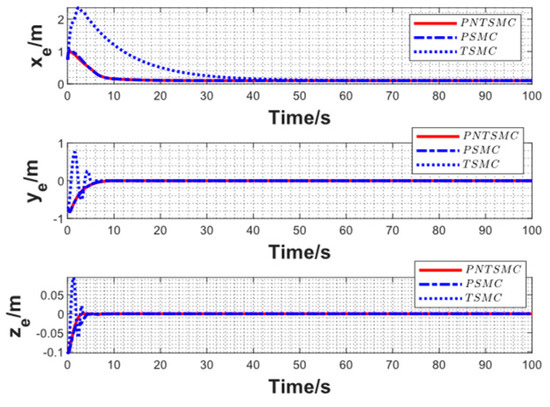 To better verify the performance of the proposed controller, the proposed controller (PNTSMC) is compared with the nonsingular terminal sliding mode controller (TSMC) and the nonsingular terminal sliding mode controller with prescribed performance (PTSMC). The initial conditions for these controllers were the same.