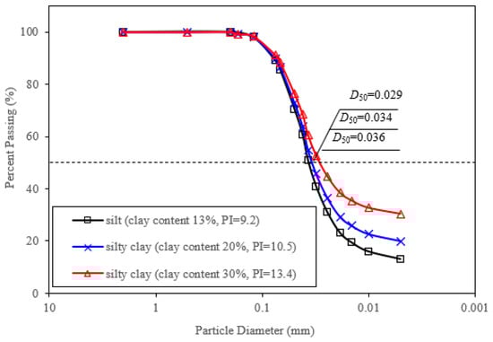 The silt used in the experiment was collected from the tidal flat of the Yellow River Delta. As the clay content of in situ soil cannot be controlled accurately, two other silty clays were obtained by adding kaolin clay. The clay minerals in the Yellow River Delta are mainly illite and kaolin [,], so kaolin clay is selected to control the soil particle size distribution. Fine kaolin clay with particle size less than 0.005 mm was used in the test. Particle size distribution curves of the tested soils are shown in Figure 1. The plasticity index (PI) of three soils is shown in Figure 1, and it was used to distinguish silt and silty clay. When the PI is greater than 10, it is named silty clay according to the soil classification method in GB50021 [].