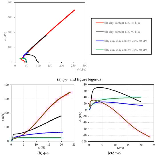 Silt samples cannot be prepared by the direct sampling method due to how the sample preparation process will cause soil liquefaction, so silt samples were obtained with the dry method. Silty clay samples were prepared with the direct sampling method from the CPTu test chamber. The porosity ratio of silt was consistent with the CPTu test at 30 kPa. The test results are shown in Figure 2 and summarized in Table 1. By comparing the triaxial test results at 46.1 kPa and 99.2 kPa, it can be known that under the condition of low stress, the dilatancy of the soil was enhanced, and the properties of silt are similar to those of sandy soil. The slope of the q-p’ critical state line of silt is consistent. Comparing the triaxial test results of soil with different clay content, the dilatancy of soil increases with the decrease of clay content. The ratio of excess pore water pressure to deviator stress at the critical state Af is related to the stress condition and clay content.