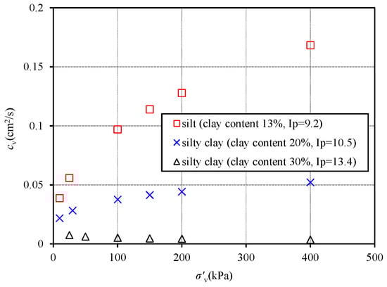 where α is assumed to be 0.5 []; For silt, λ/κ = 4.2–4.8 [], so ch ≈ 3.5cv.
