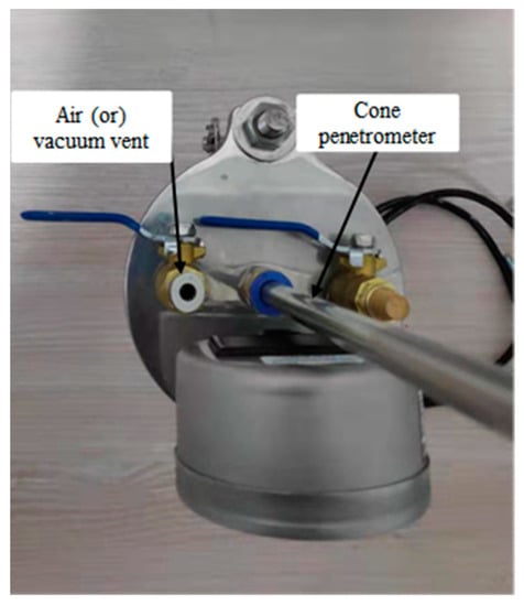 The test equipment included a pressure consolidation chamber and a velocity control penetration system, as shown in Figure 4. The penetration rig is controlled by a servo motor. The segment distance and velocity were entered through the panel on the control box. The diameter of the chamber is 600 mm, and the distance between the CPTu and the chamber wall is more than 15R. R is the radius of the CPTu, which can eliminate the boundary effect of chamber wall on the cone. The diameter of the CPTu was 1.6 cm, and the cross-sectional area was 2 cm2. The penetration depth is 250 mm below the soil surface. Pore pressure dissipation data is measured at u2 position of CPTu. The pore pressure dissipation represents consolidation of soil. Saturation was carried out for 6 h before the penetration test to ensure the accuracy of the data. The filter is saturated by being repeatedly pumped (−100 kPa for half an hour) and pressurized (+100 kPa for half an hour) six times using CPTu saturation unit (Figure 5). The test soils were prepared by the slurry consolidation method with 1.2 times of liquid limit water content.