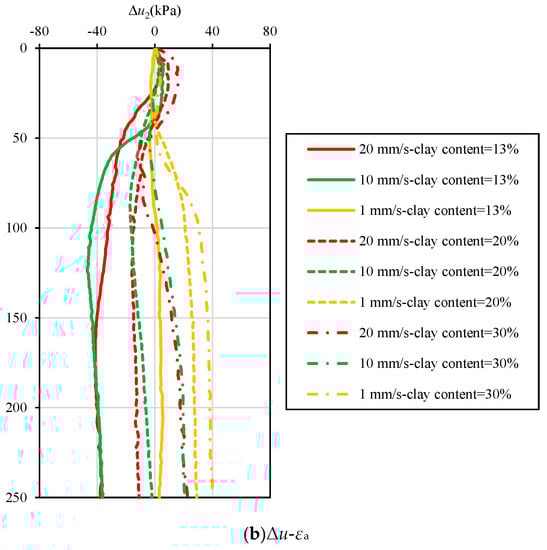 As the consolidation coefficient cv of silts is larger than that of clay, partial drainage would usually affect CPTu test data at the standard penetration rate in silts, and the interaction between the structure and soil is also affected by partial drainage [,,]. The effects of drainage on CPTu test data have been thoroughly investigated. DeJong and Randolph [] discussed the influence of partial drainage on soil classification results; Randolph and Hope [] discussed the influence of penetration rate on test results by centrifuge; Silva et al. [], Yi et al. [], and Mahmoodzadeh et al. [] discussed the influence of partial drainage on test results by numerical method. The above research is mainly aimed at contractile soils (i.e., normally consolidated clay). The normalized velocity V = vD/cv is used to represent the drainage condition. For sandy soil, Jaeger et al. [], and Suzuki and Lehane [] conducted centrifuge tests and small calibration tank tests on a normally consolidated clay–sand mixture. The results showed that the penetration rate had a significant influence on the penetration resistance of the mixture. The effect of penetration rate on the penetration resistance of sand–clay mixture is greater than that of clay.