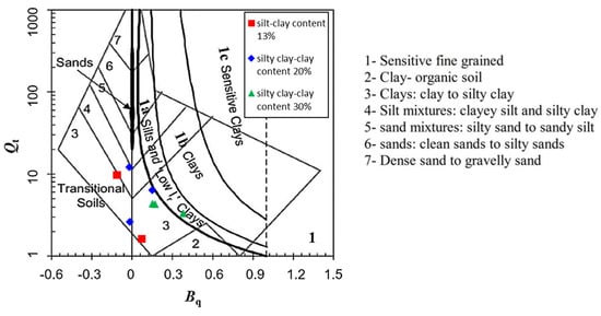 Figure 7 shows the combination of the classification diagram proposed by Robertson in 1990 [] and Schneider in 2008 []. The test results show that the soil is a type of transitional soils, and a type of silt and silty clay. There is misjudgment of soil classification in the silt with clay content of 13% and the silty clay with clay content of 20%. With the increase of Bq, Qt tends to decrease.