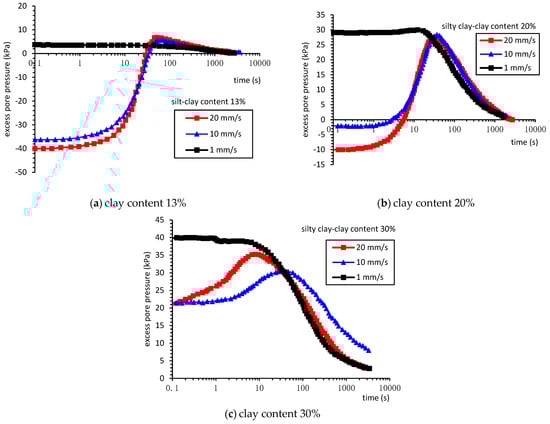 Pore pressure dissipation after penetration is shown in Figure 8. The dissipation curves of different soils differ significantly. Both silt and silty clay exhibit high dilatancy at high rates of penetration.
