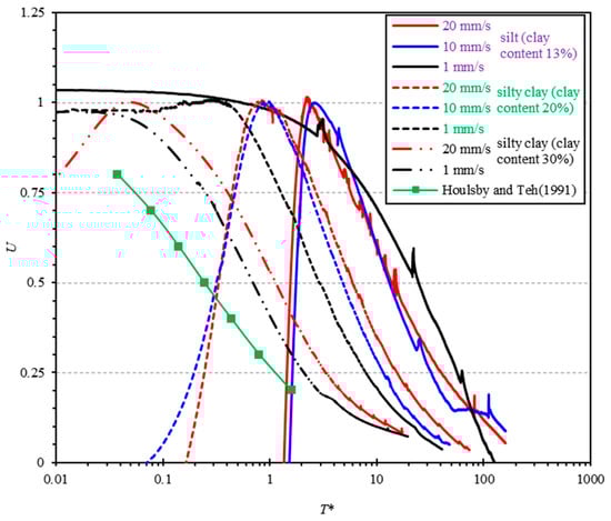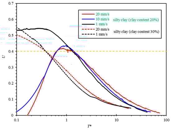 The key to the inversion of the consolidation coefficient ch is to determine the modified theoretical time factor. As the negative initial pore pressure is not conducive to estimating the dissipation curve, Δumax was adopted as the normalized parameter, and the normalized U-T* curve is shown in Figure 9. The dissipation data of silty clay with clay content of 30% at 10 mm/s were wrong and are not shown in Figure 9. Other curves showed good regularity. Figure 9 shows that the U-T* curve is related to the soil type and the drainage degree. For silt, pore pressure accumulation is small, and the extremely low penetration rate of 1 mm/s is impossible. The dissipation curves of 10 mm/s and 20 mm/s coincide, which can be taken as T50 = 13.2.