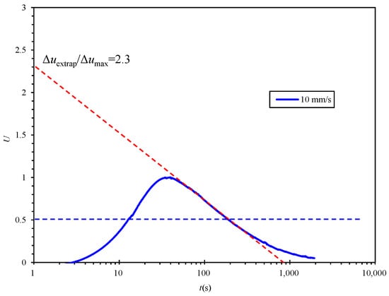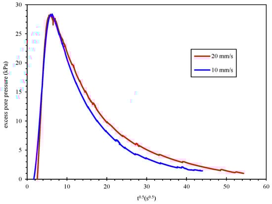 Mahmoodzadeh and Randolph [] observed that the root time method gives the most reliable results with respect to the similarity of the shape of the measured and theoretical dissipation curves, and gives the determination of Δuextrap with the root method applied to the dissipation. However, this method is not suitable for the soil in the test described in this paper. In Figure 10, the dissipation curve of silty clay with clay content of 20% is taken as an example. There is no dissipation segment close to a straight line to obtain Δuextrap, and so it is difficult to use this method in practice. Figure 9 shows that each dissipation curve is close to a straight line near T50. Δuextrap/Δumax = Umax/Uextrap, therefore, Δuextrap/Δumax can be obtained directly from the normalized U-t curve, as shown in Figure 11.
