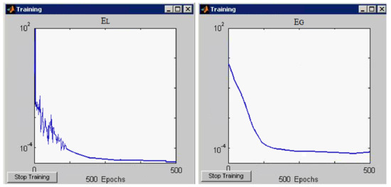 As a result, the optimal number of learning epochs was determined, based on the graphs of error changes. As can be seen from Figure 2, the number was equal to 480 epochs for a mentioned neural network structure since, for 480 epochs, the recognition error increases. In this case, the standard deviation was 0.011.