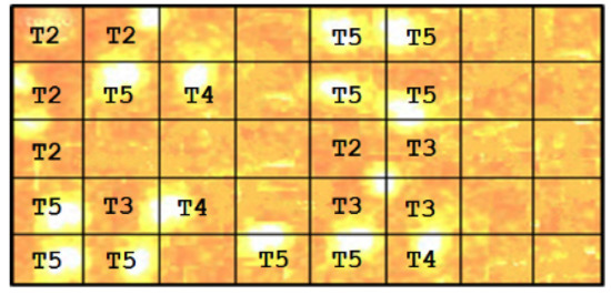 Each matrix element characterizes a specific area of the torpedo ladle car lining. Zero values indicate no damage to the sections. Based on the matrix of section conditions, it is possible to create a temperature map. For this purpose, in the software developed by the authors, the GetPixel () function is used to determine the color palette on the original image of the thermogram. Then, using standard graphical tools, a grid is generated with indications of temperatures for specific areas of lined equipment. The created map of the temperatures of the lining sections, using the example of the PM 350t torpedo ladle car, is shown in Figure 3.