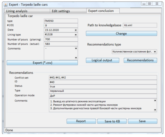 The multi-agent information system for monitoring and diagnostics of PM 350t torpedo ladle cars includes a technologist’s computer with a client software part and a workshop server for processing information regarding the technical condition of all types of lined equipment. The server part of the specialized software includes a software analyzer of thermogram images [30] and an expert system for assessing the state of torpedo ladle cars for generating control recommendations regarding their operating mode. The expert system determines the operating mode based on the neural network approach proposed and described by the authors in [31]. The software expert system for assessing the condition of torpedo ladle cars is shown in Figure 5.