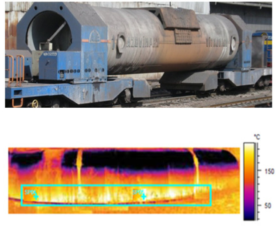 The developed means were used to determine burnout zones of the ladle car lining. Thermal imagers were used to create thermograms’ images for the torpedo ladle car PM350. To recognize the ladle car thermograms, which is demonstrated in Figure 6, the developed software was used.