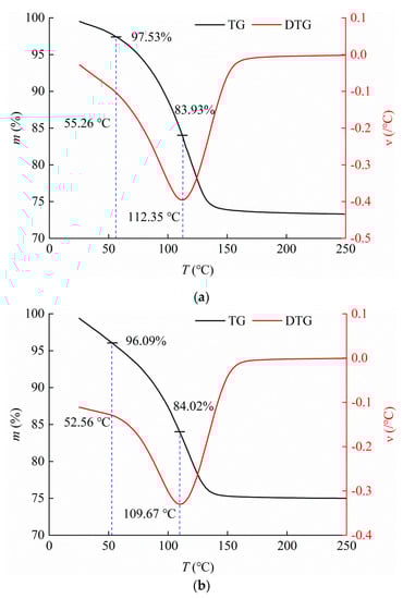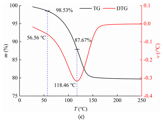The dehydration process of TJ can be segmented into three phases based on the TG-DTG curves. Two demarcation temperatures appear at 55.26 °C and 112.35 °C. The first phase is from room temperature to 55.26 °C. The sample mass slowly decreases with temperature, which manifests as a gentle oblique straight line in the DTG curve. This phase represents the dehydration process of free water. The second phase is from 55.26 °C to 112.35 °C. The mass loss rate of the sample increases with increasing temperature until it reaches the maximum. This phase represents the dehydration process of WBW. The third phase is from 112.35 °C to 250 °C. The mass loss rate decreases with increasing temperature, indicating the release of a new type of water, i.e., SBW [22,34].