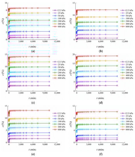 Vertical strain-time (ε–t) curves (Figure 3) of reconstituted samples under different vertical stresses all present typical decay creep characteristics. The overall trend is manifested as a certain amount of transient strain at the moment of loading, which increases with vertical stress (). After transient deformation, ε gradually enters the decay and stable creep phase. Strain increases with time with decreasing growth rate. None of the ε–t curves have a sharp flow stage. The vertical strain increases with the absolute water content at the same vertical stress and time (Figure 3a–d). TJ has the highest vertical strain in the three soils at similar absolute water contents (Figure 3c,e,f) and the same vertical stress and time, followed by QD and WH, which is due to the difference in the void ratios of the three soils.