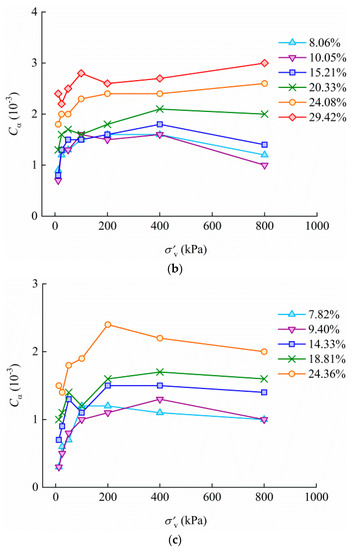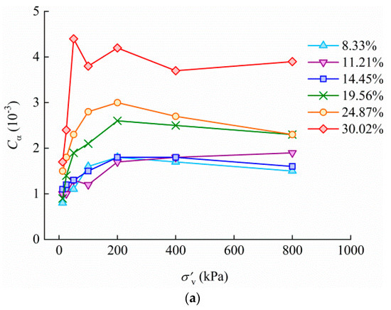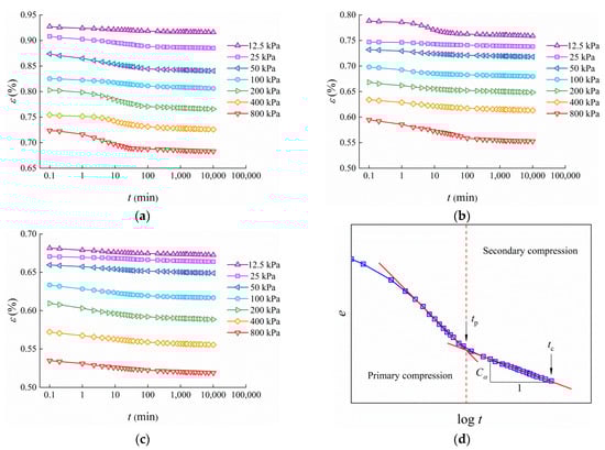 Uniaxial confined compression for clays typically consists of two processes: primary and secondary compression. Secondary compression (creep) is related to continuous readjustment of clay particles and pore water, which is manifested as continuous vertical deformation with time under an approximately constant stress after primary compression [13,14]. It is generally recognized that creep behavior is essential in evaluating long-term deformation (post-construction settlement) [15]. Secondary compression is a long-term process that often requires experiments or models to predict. The secondary compression coefficient (Cα) is the most widely used parameter for describing and predicting secondary compression with conciseness and general applicability [13,14,16].