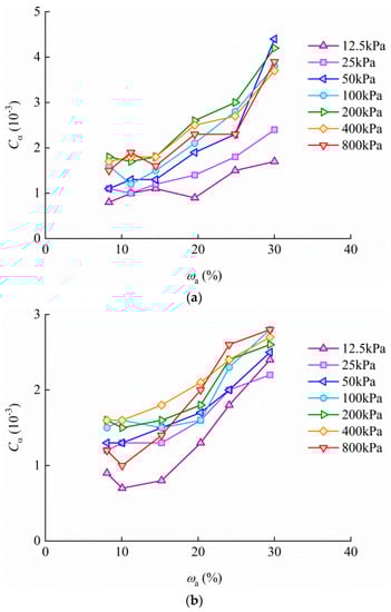 There is only SBW in the soil before the SBW limit (ωa < ωs). Soil particles are mainly connected by SBW, which was once thought to be similar to the solid phase in terms of its properties [26]. Secondary compression is mainly from the dislocation of particles and air discharge, and the SBW content is almost unchanged during compression due to the strong connection force between SBW and particles. The connection force and sliding friction force between soil particles are so strong that relative motion among particles is difficult, causing only a slight change in Cα with the increase in ωa.