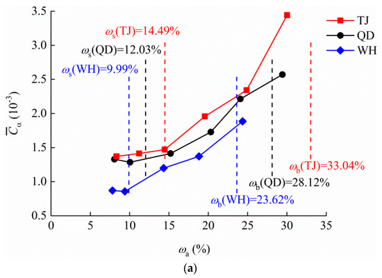 On the basis of determining the limits for SBW and WBW, this paper explores the effect of bound water content on secondary compression by establishing a quantitative relationship between Cα and ωa. When ωa < ωb, the value of ωa represents the bound water content in the sample. Figure 6a–c shows the effect of ωa on Cα for TJ, QD and WH. A general trend of the plotted data is that Cα increases with ωa, which agrees with Mesri et al. [36] and Shahriar and Jadid [15], who observed that Cα at a particular vertical stress increases with increasing initial water content. Note that when ωa < ωs, i.e., when only SBW is present in the soil, increasing ωa does not have a significant impact on Cα overall. However, when ωa > ωs, i.e., when SBW and WBW coexist in the soil, Cα increases significantly with increasing ωa.