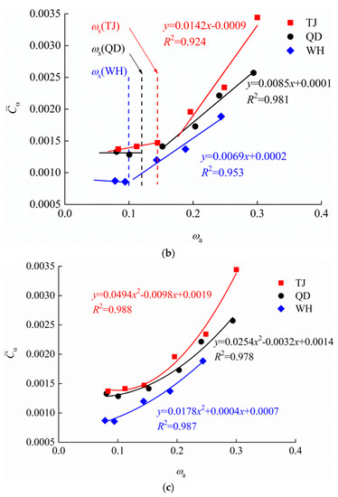 The –ωa relationship can also be expressed in the form of a quadratic polynomial, as shown in Figure 7c and Equation (3). The correlation coefficient (R2) values for TJ, QD and WH in Equation (3) are 0.988, 0.978 and 0.987, respectively.