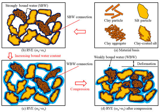 A conceptual model (Figure 8) is proposed to expound the interactions and associations between particles and different types of pore water in a representative volume element (RVE) and delineate the controlling mechanism of bound water on secondary compression from the standpoint of system synergy instead of the evolution of individual elements based on the grain fractions, mineral components and pore water characteristics of three marine silty clays considering that the schematic diagram [34,40] is widely used for mechanism explanation. The proposed conceptual model is a four-level hierarchy. Tier I consists of clay particle and silt particle. Tier II includes two major larger units, clay-coated silts and clay aggregates as most particles are present as clay-coated silts and clay aggregates instead of as individual units [34]. Tier III (Figure 8b) represents the particle–water system under the condition of ωa < ωs consisting of strongly bound water and the elements of tier II. In tier IV (Figure 8c), weakly bound water is included in the particle–water system to represent the distribution of pore water and the state of particle connection for the condition of ωa > ωs. Figure 8d shows the condition of the particle–water system (tier IV) after compression under a certain vertical stress. The particle orientation is also considered in the model.