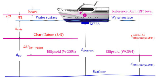 where is the separation model height from CD-to-ellipsoid (WGS84), is the ellipsoidal height estimated from GNSS/INS integrated navigation system transformed to the reference point (RP) of the survey vessel, is the tide height records referenced to CD, is the heave value estimated from the INS system, is the dynamic draft value of the vessel that is dependent on the vessel speed and is waterline height from the reference point to the water surface.
