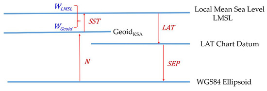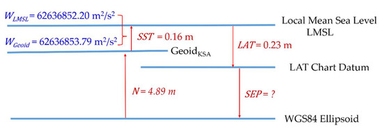 The estimated separation model from hydrographic surveying test can be validated with gravimetric/oceanographic method, as shown numerically in Figure 12. The separation height model at the marine science tide gauge in the Sharm Obhur is estimated based on Equation (2) in Section 2.2 with known lowest astronomical tide value (LAT = 0.23 m is estimated from tidal constituents derived in by Shamji and Vineesh [23]), known gravimetric geoid height (N = 4.89 m value is obtained from Al-Kherayef [24]) and sea surface topography (SST = 0.16 m, estimated from equipotential values given in Al-Kherayef [24]); then the SEP equals: