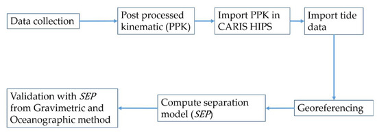 This research paper’s organizational structure is divided into six main sections. The first section (this section) provides the literature reviews and the objective of this research. The second section explains the separation model development using the proposed multibeam hydrographic surveying approach and the validation using the gravimetric/oceanographic method. Section 3 presents the methodology for developing the separation model under investigation. The fourth section describes the study area and all collected data using multibeam surveying system along with all required ancillary data for hydrographic data postprocessing. Section 5 shows, analyses and discusses the developed separation model and accuracy. Finally, Section 6 concludes the findings and importance of developing a separation model using the multibeam hydrographic surveying method.