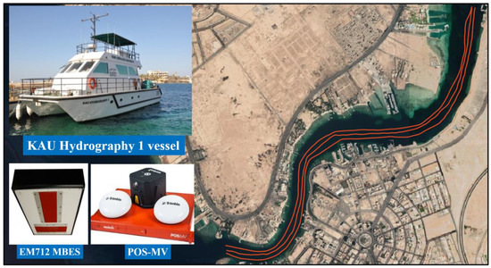 To develop separation model, the navigation measurements were collected from POS–MV system, and the multibeam data measurements were collected from EM712 Multibeam Echosounder System (MBES) on March 4th, 2018, in Sharm Creek, Jeddah, in Saudi Arabia on board a hydrographic surveying vessel called “KAU Hydrography 1” owned by the Department of Hydrographic Surveying, Faculty of Maritime Studies of King Abdulaziz University. Figure 4 shows the test survey track lines in the Sharm Obhur. The tide gauge data were extracted from the Aramco tide data table for the Jeddah tide gauge stations. The real-time heave and true (delayed) heave were obtained from the POS–MV system. The PPK GNSS/INS integration navigation data were obtained from POSPac software. The list of collected data are provided in Appendix A.