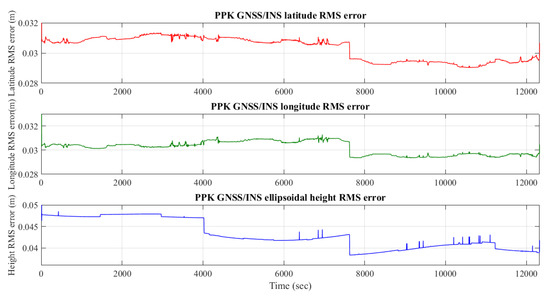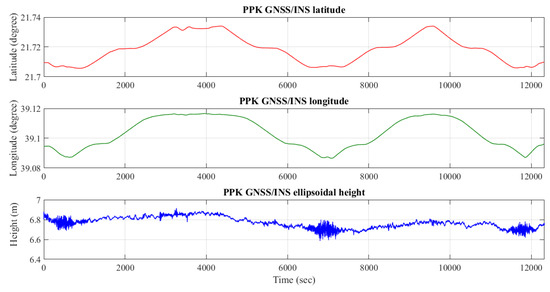 PPK GNSS/INS-integrated navigation solution for latitude, longitude and ellipsoidal height from POSPac software.