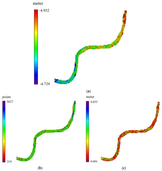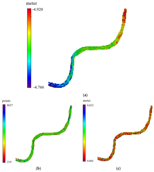 Two separation models were developed using CARIS HIPS and SIPS software based on real-time heave and delayed heave, respectively. Figure 10 shows the developed separation model using the real-time heave solution. Figure 10a shows the separation height between the chart datum and WGS84 at model grid nodes that range between −4.932 m to −4.729 m. Figure 10b shows the density of the number of points employed to estimate the separation heights at the grid nodes that range between 219 points and 8627 points. Figure 10c shows the standard deviations associated with the estimated separation heights at the grid nodes that range between 0.001 m and 0.035 m.