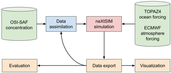 neXtSIM-F is a fully Lagrangian sea ice model being developed at NERSC [30]. The model runs on an adaptive triangular mesh with an average side length of 10 km (with the distance from each point to the opposite side being about 7.5 km) and is interpolated to a regular 3 km grid for distribution [27]. The overall scheme of the model, including information on forcing and data assimilation, is depicted in Figure 2. SIC data are assimilated as a weighted average of the Advanced Microwave Scanning Radiometer 2 (AMSR2) and Special Sensor Microwave Imager/Sounder (SSMIS) products as described in Williams et al. (2021) [27]. The model was initialised in October 2018 using SIT from the merged CryoSat-2 and Soil Moisture and Ocean Salinity (CS2SMOS) product from AWI [31].