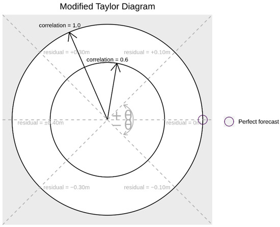 An example of a modified Taylor diagram, where the correlation coefficient is represented by the radial distance from the origin and the mean residual by the angle from the positive x-axis.