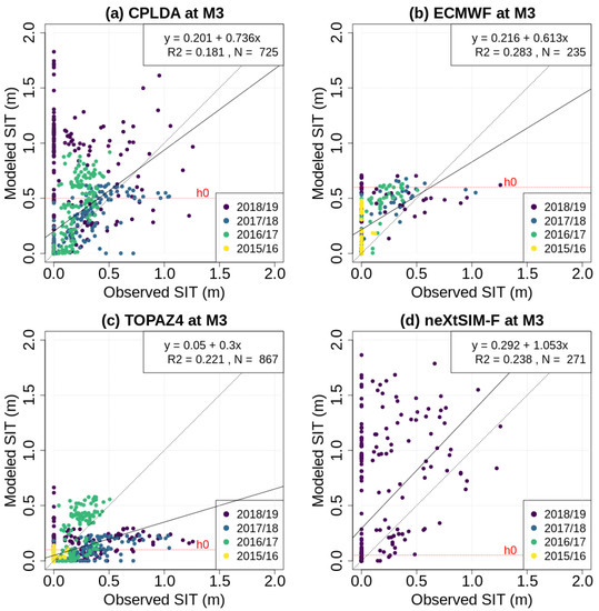 Scatter plot of daily average model analysis fields against mooring observations of SIT at mooring M3 for the following: (a) CPLDA; (b) ECMWF; (c) TOPAZ4; and (d) neXtSIM-F. Different colours represent the values from different winter observational campaigns. The line x = y (dashed) is depicted as well as the model regression line (solid) and the value for the model tuning parameter h0 (red, dashed).