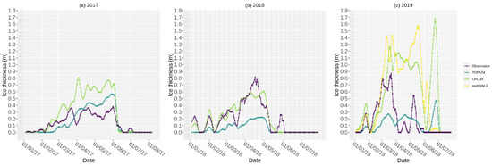 The model systems appear to perform poorly in 2019 at the mooring location M3, with all four models having a large number of days where the analysis field modelled SIT is high, but the observed values are zero. This overestimation of SIT is evident in the scatter plots of daily modelled and observed SIT (Figure 5) and can be observed for all four models. By plotting different winters in separate colours, it is apparent that the models do not generally overestimate the SIT in this manner.