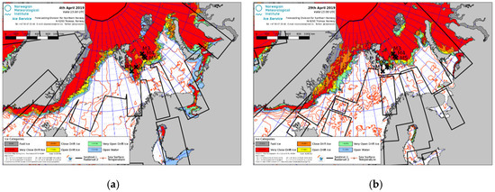 Ice charts for the following: (a) 4 April 2019; (b) 29 April 2019. These charts show localised areas of close drift ice near the mooring M3 [36].