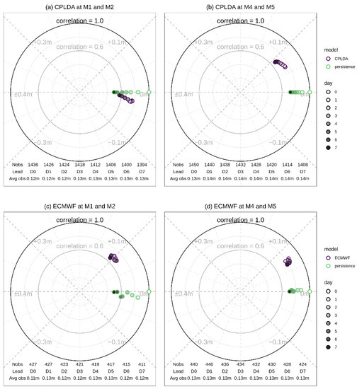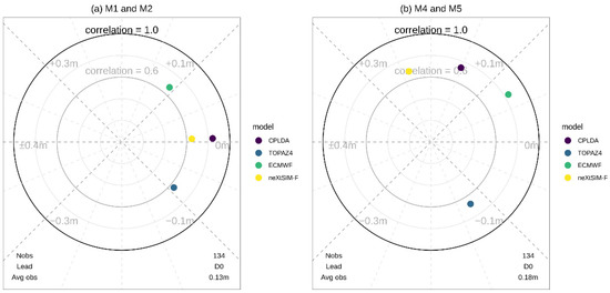 Modified Taylor diagrams for CPLDA, TOPAZ4, ECMWF and neXtSIM-F models for November 2018–July 2019 for the analysis fields at moorings: (a) M1 and M2; (b) M4 and M5. As well as correlation coefficients and mean residuals, the number of total observations and the average SIT across observations are displayed at the bottom of the plot.