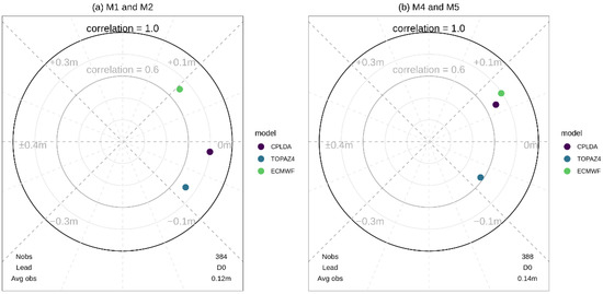 Modified Taylor diagrams for CPLDA, TOPAZ4 and ECMWF models for December 2016–July 2019 for the analysis fields at moorings: (a) M1 and M2; (b) M4 and M5.
