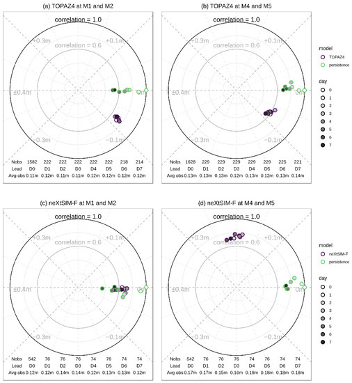 Mean residual and correlation coefficients for lead times of 0–7 days for forecast fields of: (a) TOPAZ4 at M1 and M2; (b) TOPAZ4 at M4 and M5; (c) neXtSIM-F at M1 and M2; (d) neXtSIM-F at M4 and M5.